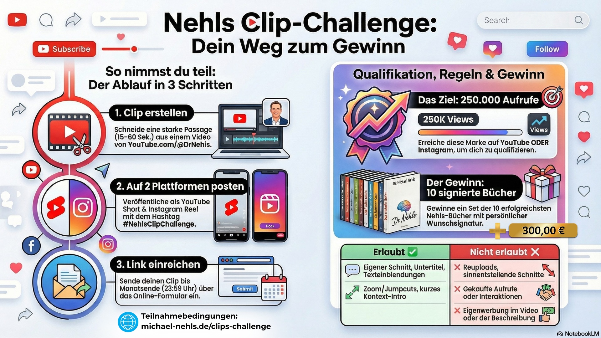 Erstellen Sie Kurzclips aus den Inhalten von Dr. Michael Nehls – und gewinnen Sie ein Set der 10 erfolgreichsten Nehls-Bücher mit persönlicher Wunschsignatur und 300,-€ per Banküberweisung.